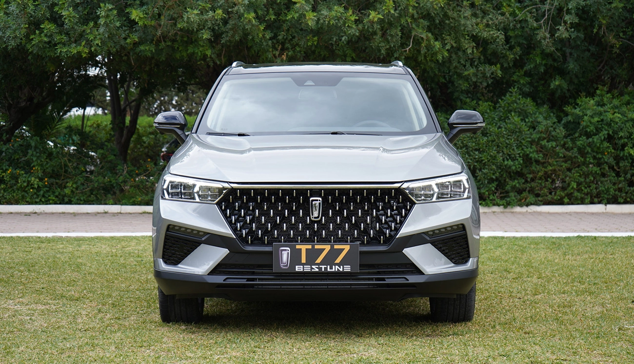 Un front pionnier : La calandre hexagonale emblématique du T77 PREMIUM est incrustée de nombreuses pièces argentées numériques de style goutte de pluie, créant une image de façade dynamique et futuriste.